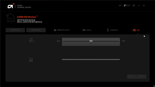 ▲ 설정 탭에서는, 게임과 음성의 밸런스를 조정할 수 있습니다. 해당 기능은, 헤드셋 우측 이어컵의 버튼으로도 조정이 가능합니다.
