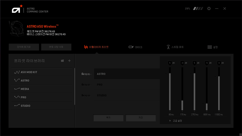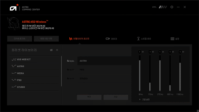 ▲ 아스트로 A50은, 전용 소프트웨어인 아스트로 커맨드 센터를 사용할 수 있는데요. 해당 프로그램을 통해, 이퀄라이저와 마이크, 프리셋 등을 설정하고 저장하거나 불러올 수 있습니다.